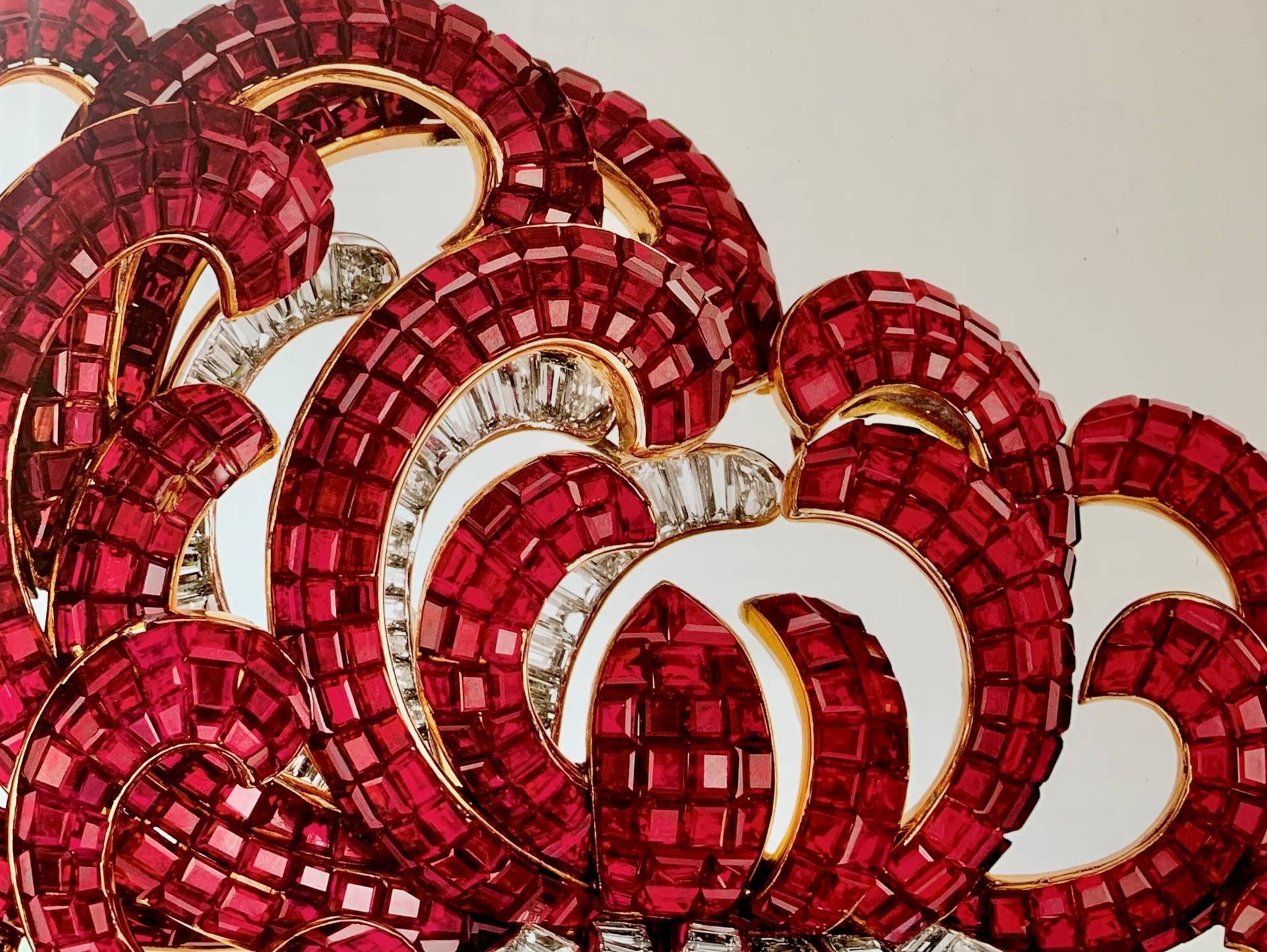 L’exposition retrace chronologiquement et très pédagogiquement l’évolution des bijoux de 1920 à nos jours. Par exemple, les années 20 sont illustrées par des bijoux incarnant le thème floral que la maison déclinera sous toutes ses formes. A cette époque, les sujets varient autour de la flore et la faune mais aussi du goût pour l’Egypte ancienne, la Chine, le Japon ainsi que la civilisation persane qui deviennent à leur tour prétexte pour initier de nouvelles combinaisons de couleurs : lapis-lazuli, turquoise, onyx, jade, corail, émail et laque sont associés aux pierres précieuses. Parallèlement, la joaillerie blanche utilisant le diamant et le platine – dont les formes abstraites et géométriques dessinent de légers reliefs – inscrit la maison dans le courant de l’Art Déco.