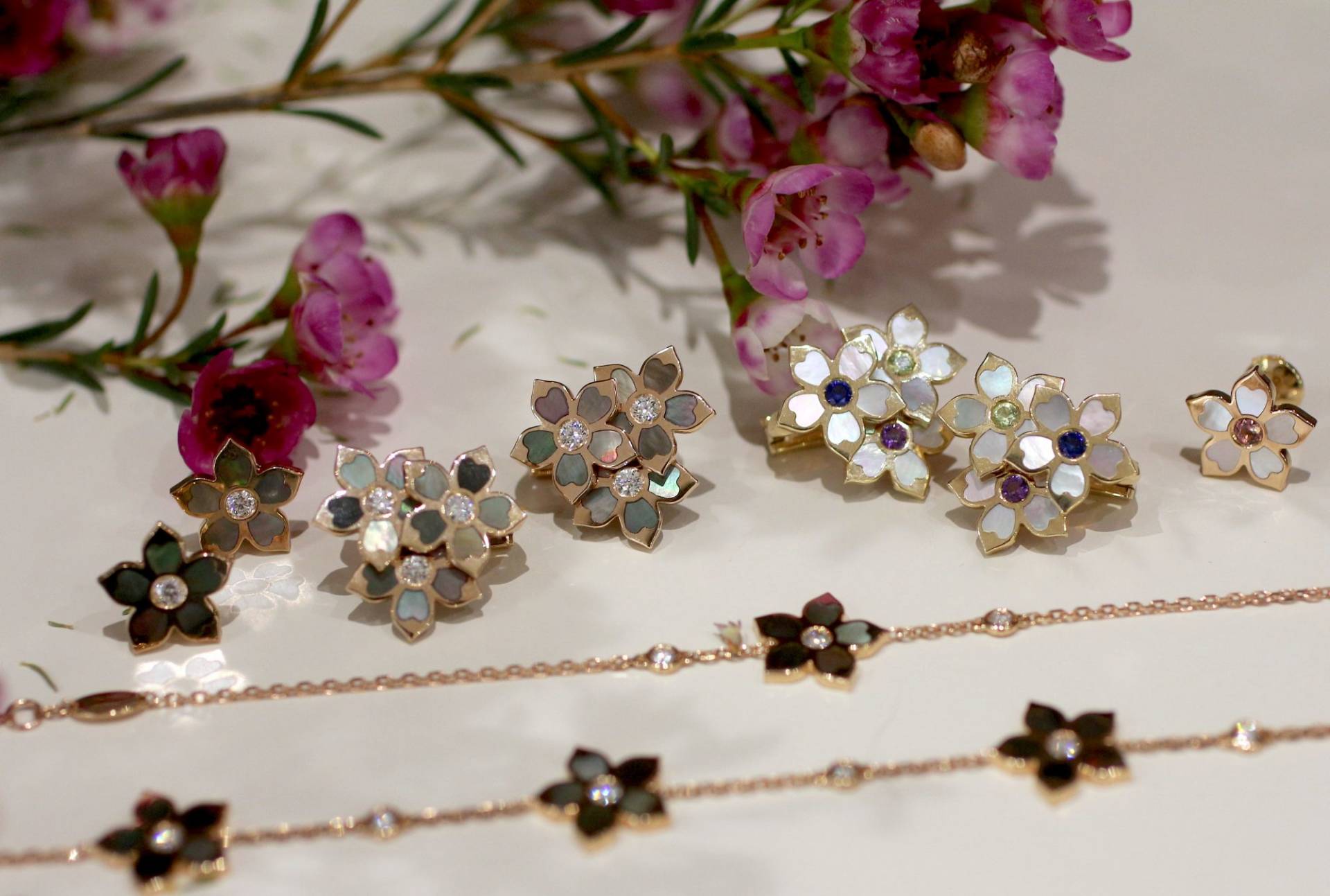 En effet, Olga Corsini fait appel aux Métiers d’Art et explore la technique de l’entaille inspirée de la tradition florentine de marqueterie sur marbre appelée en italien «SCAGLIOLA». Cette technique de marqueterie consiste en un minutieux travail manuel de retaille des motifs – 5 pétales de nacre entaillés à la main en forme de cœur – et de sertissage parfaitement ajusté qui confère un seul et unique niveau à la fleur. Le motif est également rappelé au verso du bijou ce qui lui lui donne un aspect à la fois très pur et très moderne.